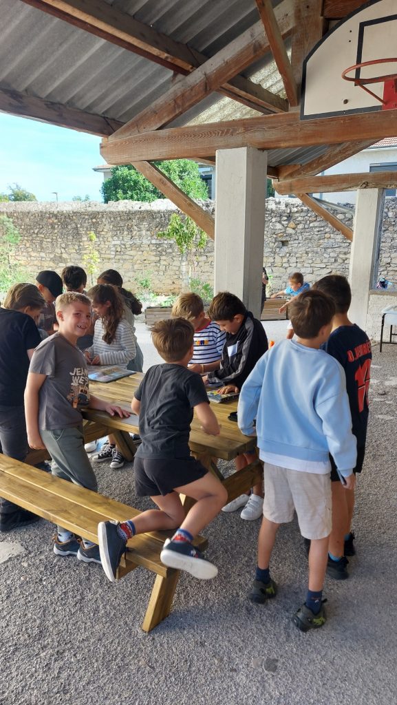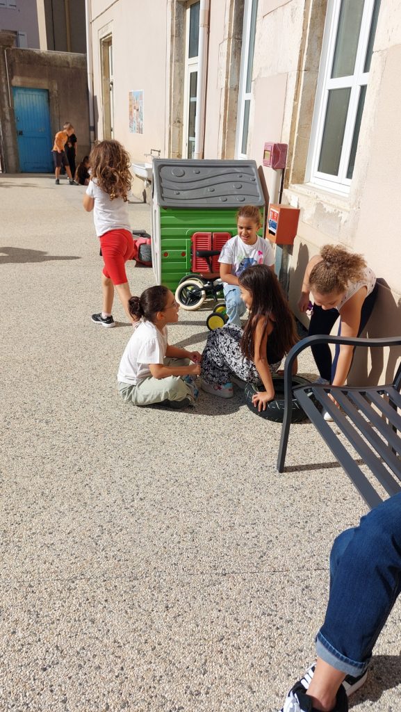 La cour s’équipe en jeux : une maisonnette, des petits vélos, des pneus. Notre APEL a installé plusieurs bancs, une table/bancs en bois et deux bacs à sable et à eau. D’autres équipements complémentaires vont encore bientôt être achetés pour le plaisir de tous !